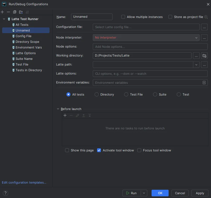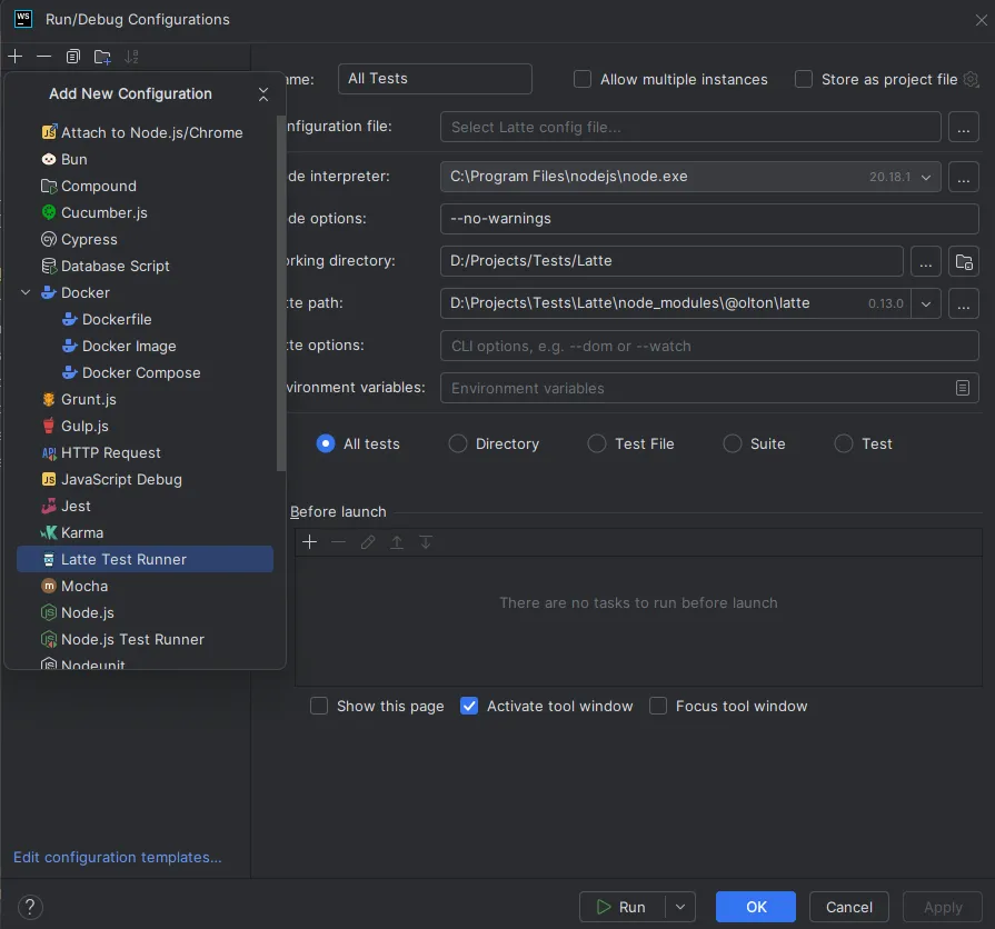 +button to add a new configuration and selectLatte Test Runner - Fill required fields in the new configuration options dialog.